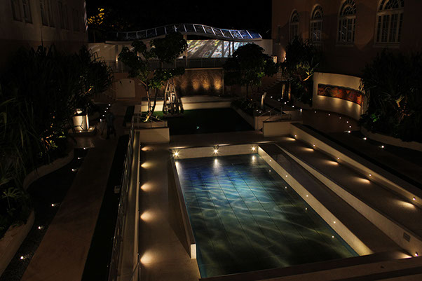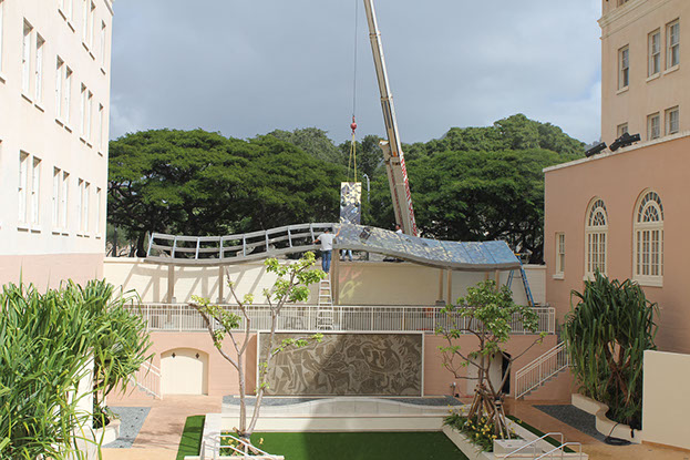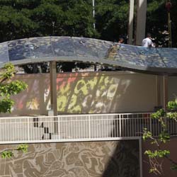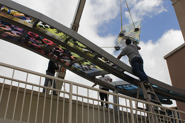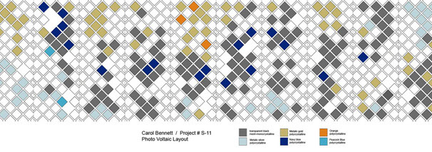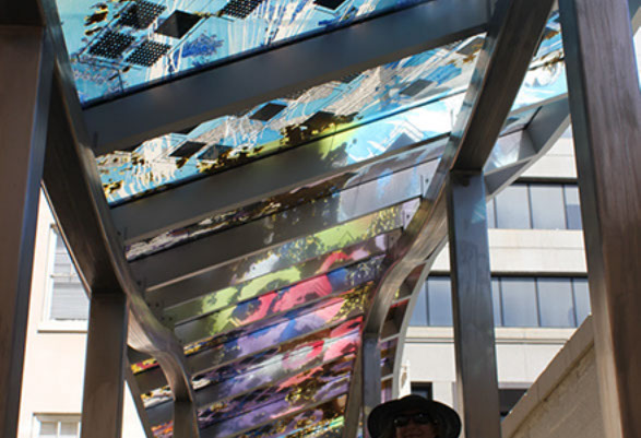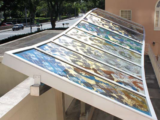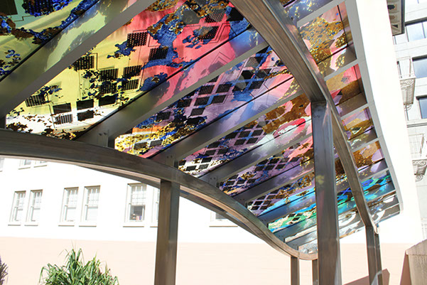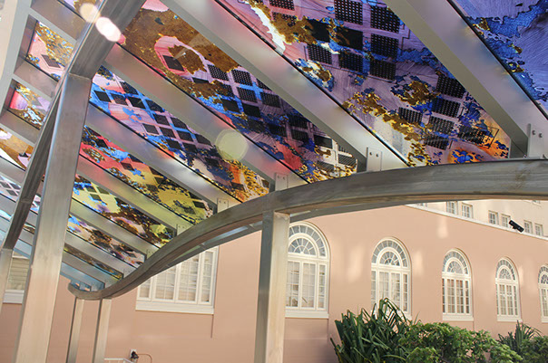 Description: Canopy shelters from the sun and plays with natural light: transparent, colored and opaque glass project patterns upon the Sculpture Garden walls, stairs and patrons and changes throughout the day. Solar cells collect energy that is fed into Museum Mainframe and assist in powering flood light that illuminate the canopy by night.